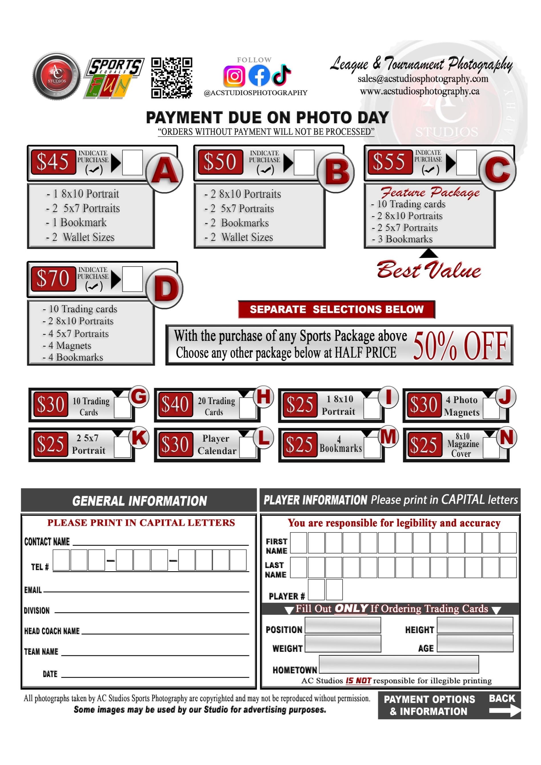 Each player will be given a "memory mate" from the association that has their individual photo and team photo on it. If you would like to order additional items please see the attached package options. The special team promo needs to be coordinated through your coach/manager.