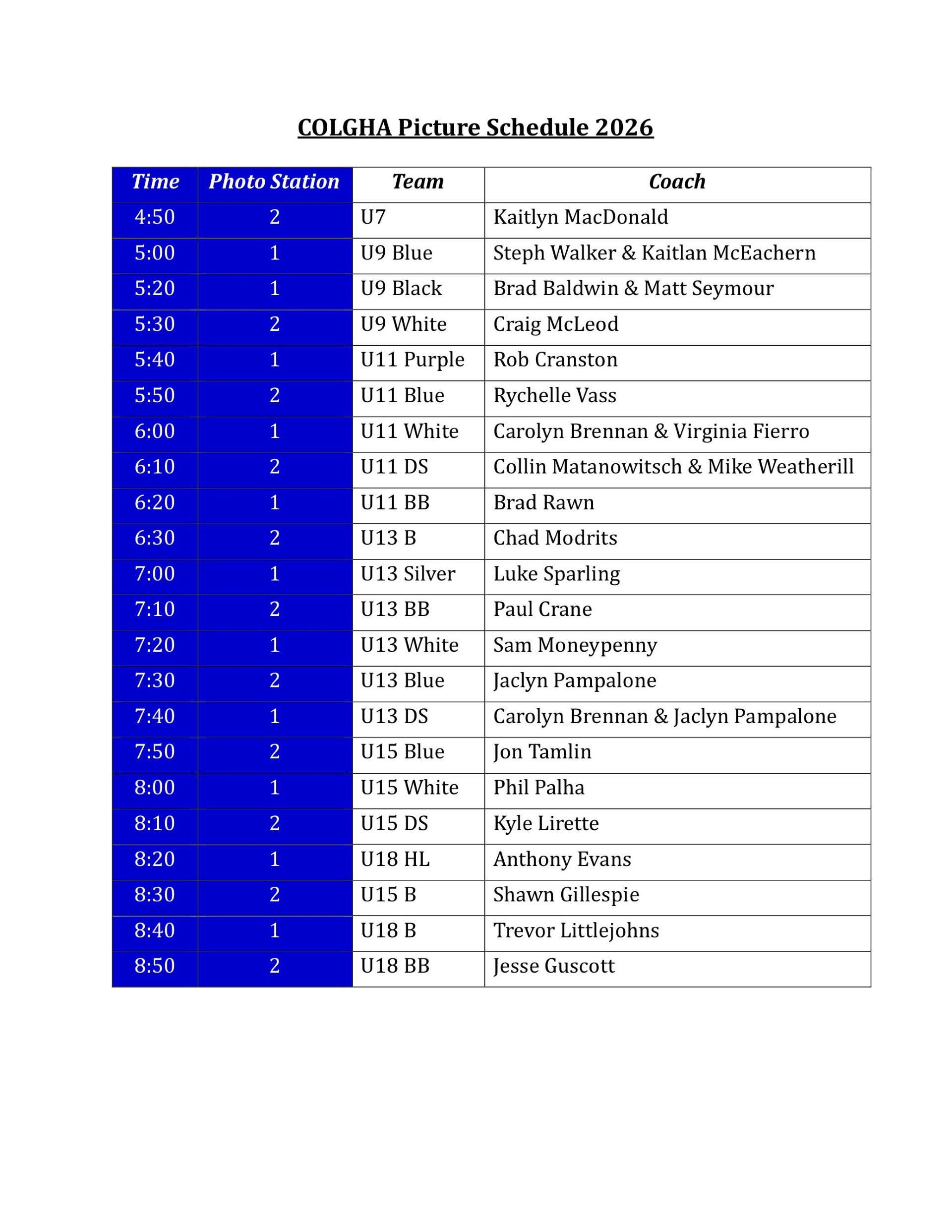 Picture day is Tuesday, February 3rd at Central Park Arena in the big room upstairs. Each team has a scheduled time slot. All players are asked to come dressed in full equipment minus skates, neck guards, and helmets. For teams that have sets of blue and white jerseys, please wear your blue set. Please arrive 15 mins before your timeslot in order to register with the photographer.